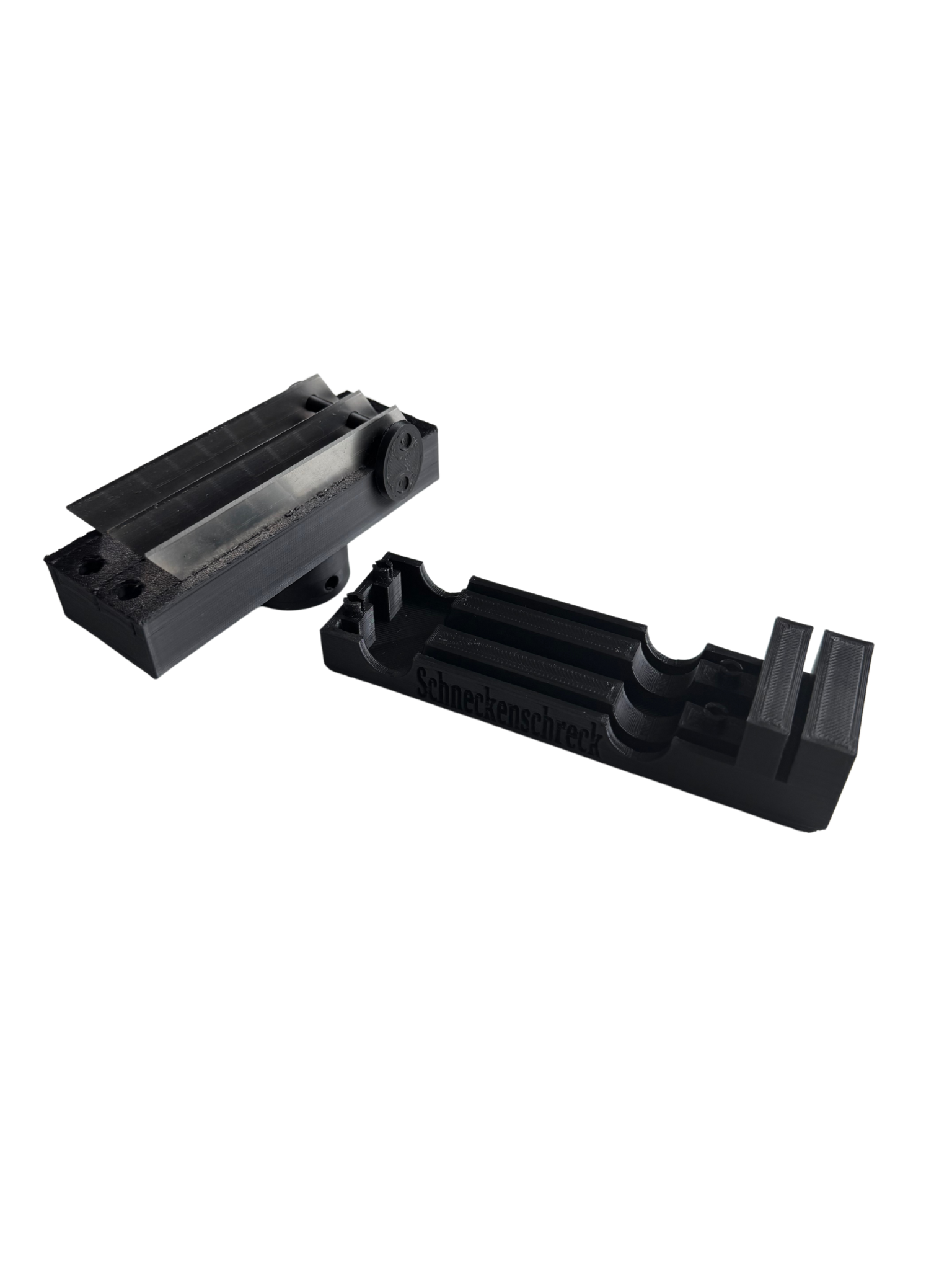 Die Oberseite enthält zwei massive Reinigungsblöcke, mit denen du die Klingen ohne direkten Hautkontakt säubern kannst – ganz ohne Wasser.